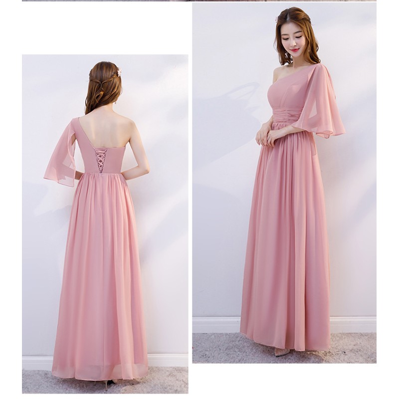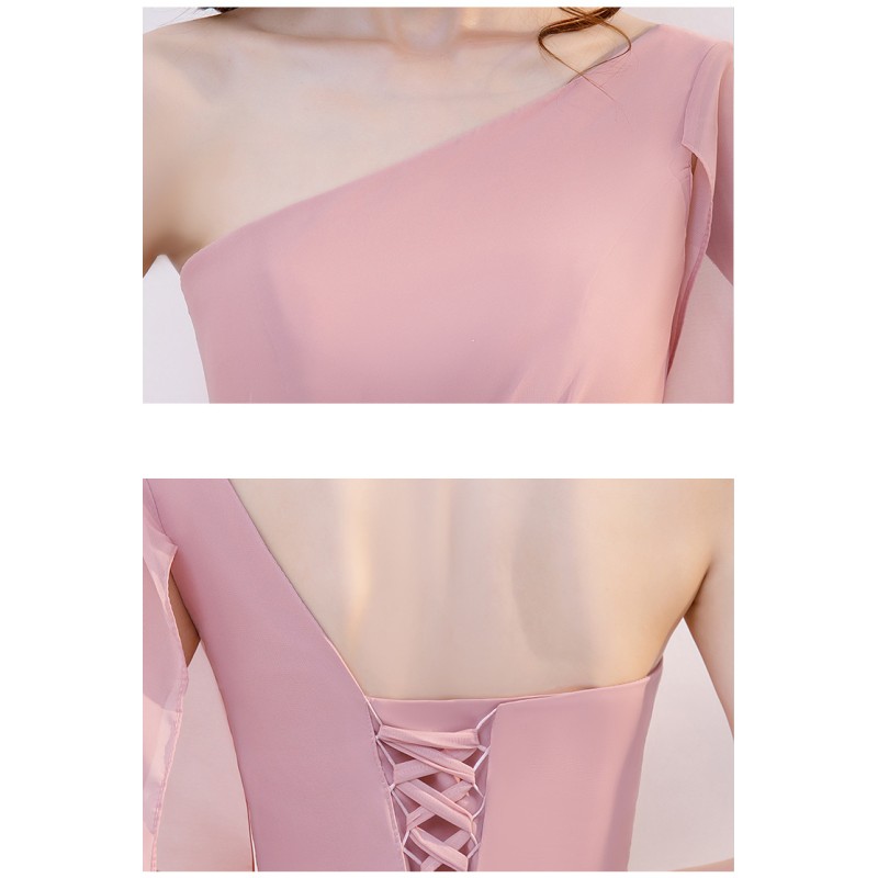 This charming bridesmaid dress features a sophisticated one - shoulder style, exuding elegance and modernity. The soft pink hue is both romantic and flattering, suitable for a variety of wedding themes. A flowing chiffon sleeve adds a touch of grace and movement, while the ruched bodice accentuates the figure. The long, flowing skirt creates a dreamy look, and the back's lace - up detail not only offers an adjustable fit but also adds a romantic flair. Perfect for being a part of a wedding entourage, it combines style and comfort seamlessly.