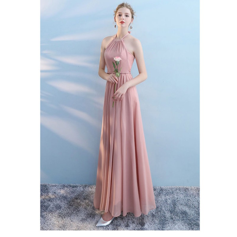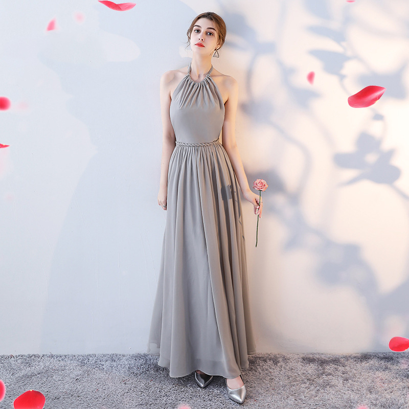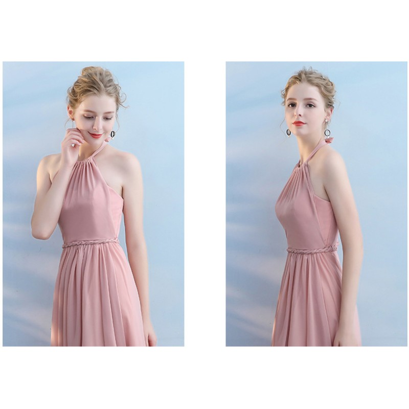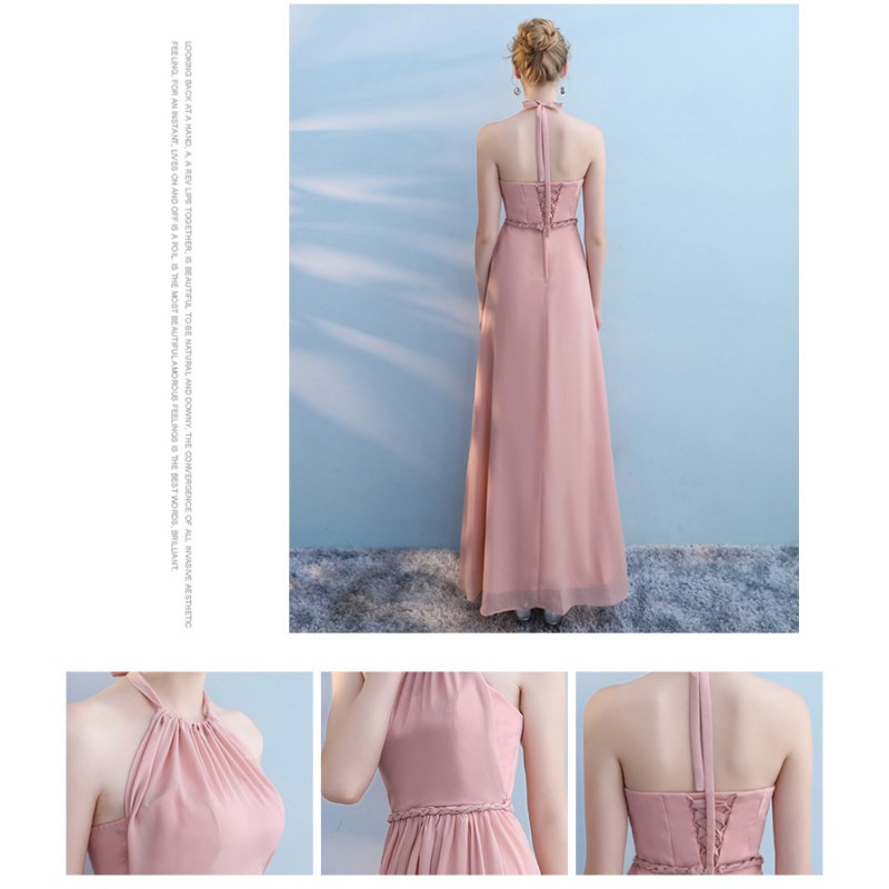 This graceful bridesmaid dress features a flattering halter - neck design that showcases the shoulders and neckline. The bodice is ruched for a figure - enhancing effect, and the waist is accentuated with a delicate braided belt, adding a touch of detail. The flowing chiffon skirt in soft colors like light pink and gray creates a dreamy and elegant look. The back has a lace - up detail, allowing for an adjustable fit and adding a romantic element. Ideal for weddings, it combines style and comfort, making bridesmaids look charming and poised.