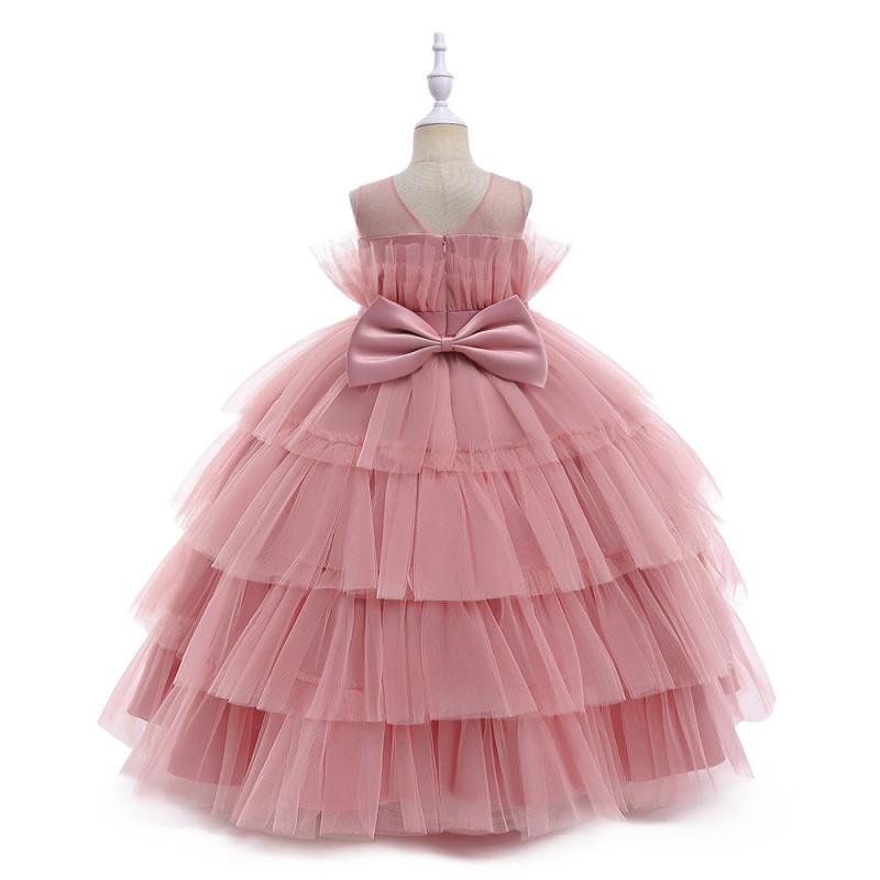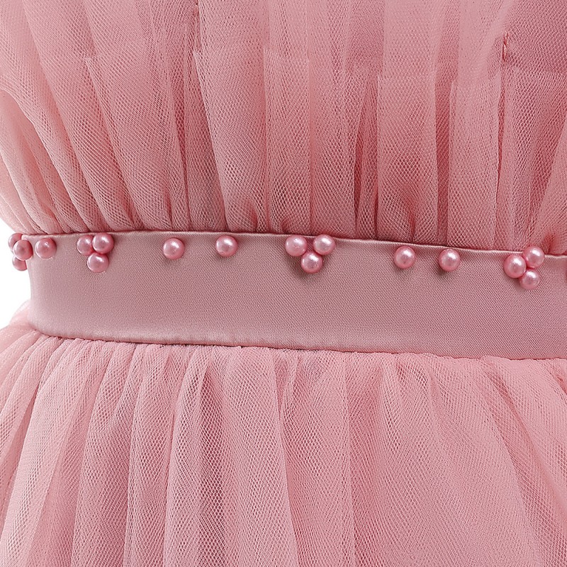 This charming girls' party dress features a lovely bean pink tulle skirt with multiple layers, creating a fluffy and elegant look. The dress has a strapless design and a beautiful bow at the back, adding a touch of sweetness. It also includes a satin belt adorned with delicate pearls around the waist for an extra touch of sophistication.