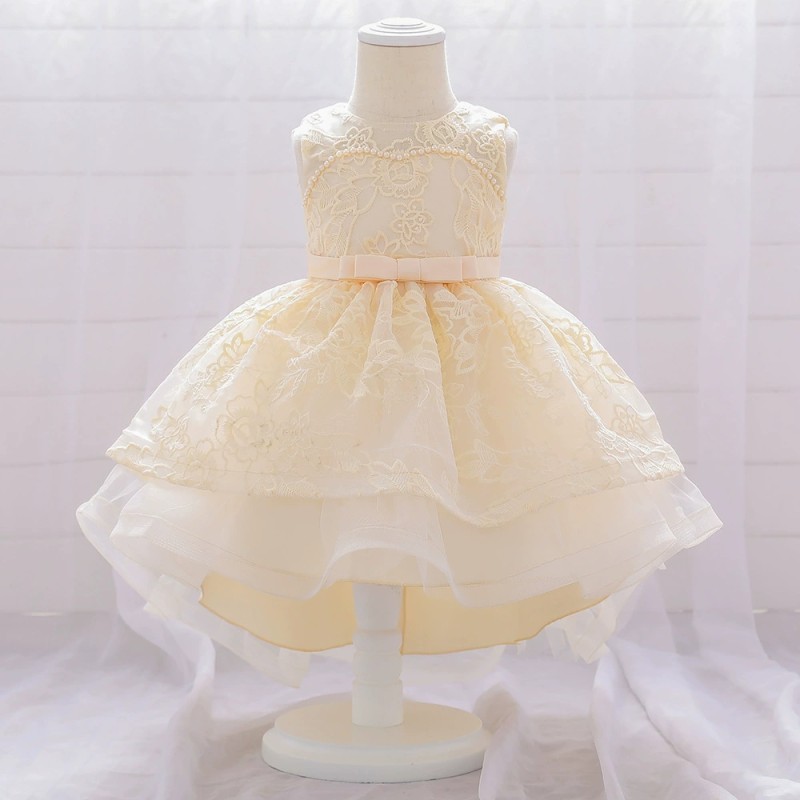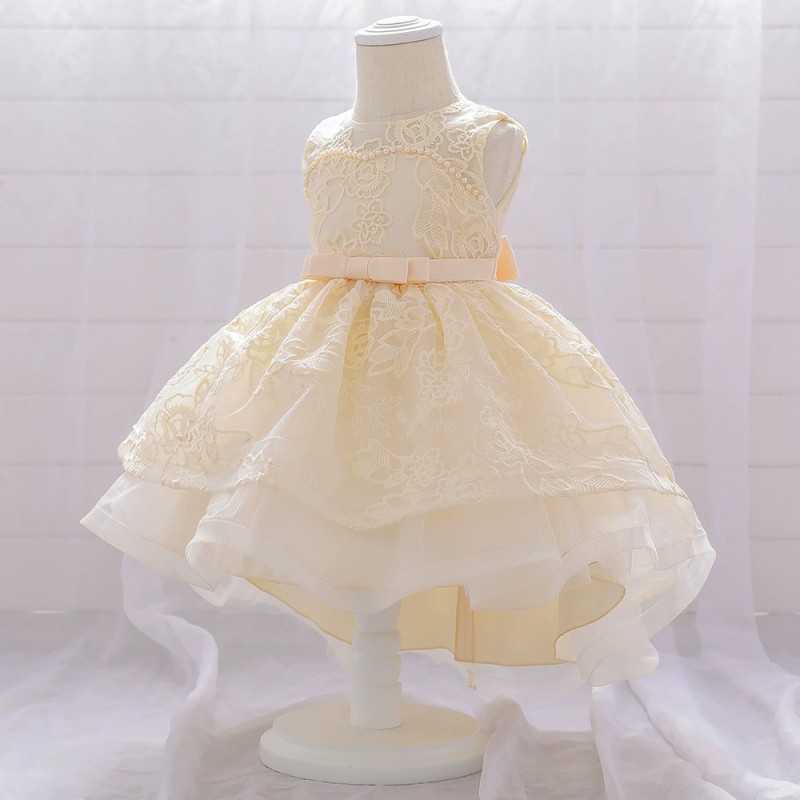This enchanting flower girl dress features a beautiful champagne hue and is crafted with delicate lace that showcases intricate floral patterns. The dress has a charming high-low hemline, adding a touch of elegance and uniqueness. It is adorned with a sweet bow at the waist, enhancing the overall adorable look. Perfect for weddings or special occasions, this dress will make any little girl feel like a princess.