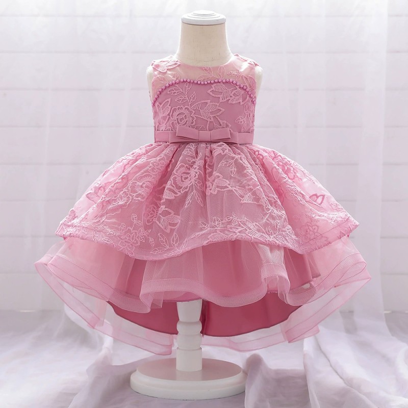 This enchanting flower girl dress features a beautiful pink hue and is crafted with delicate lace that showcases intricate floral patterns. The dress has a charming high-low hemline, adding a touch of elegance and uniqueness. It is adorned with a sweet bow at the waist, enhancing the overall adorable look. Perfect for weddings or special occasions, this dress will make any little girl feel like a princess.