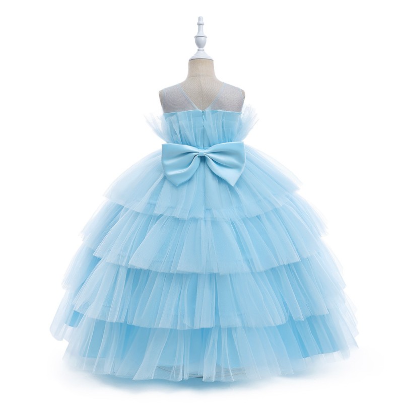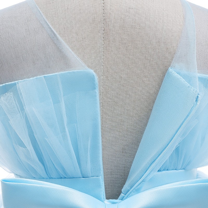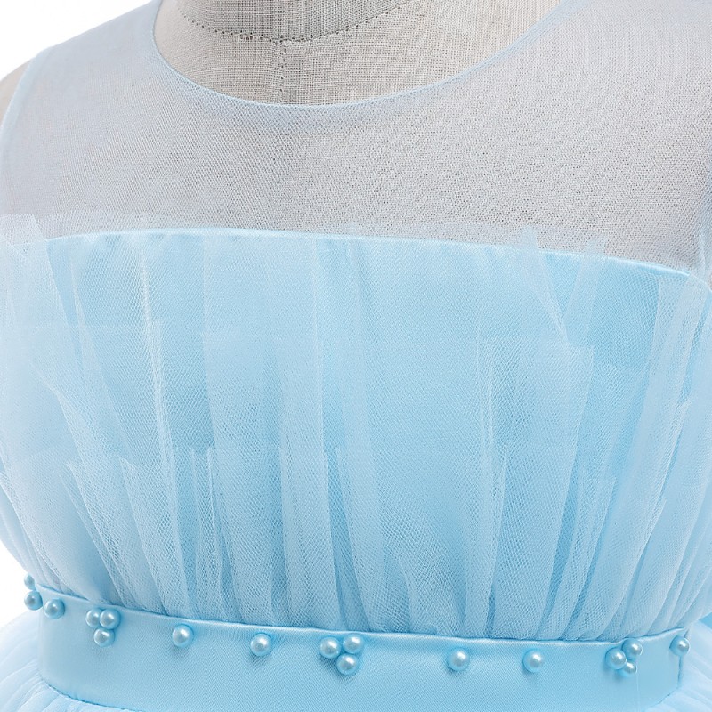 This charming girls' party dress features a lovely sky blue tulle skirt with multiple layers, creating a fluffy and elegant look. The dress has a strapless design and a beautiful bow at the back, adding a touch of sweetness. It also includes a satin belt adorned with delicate pearls around the waist for an extra touch of sophistication.
