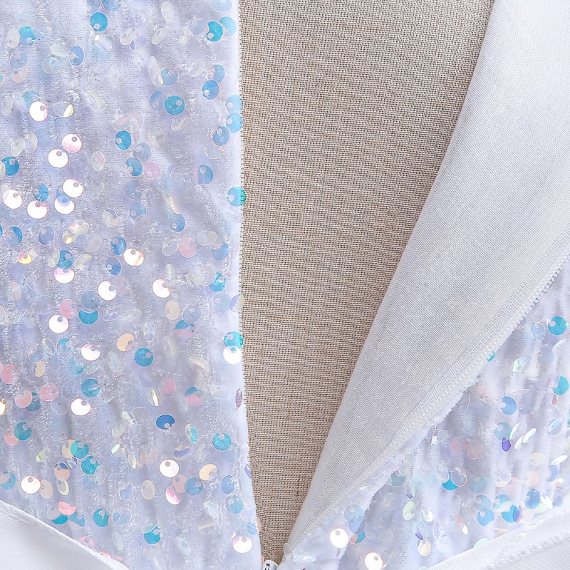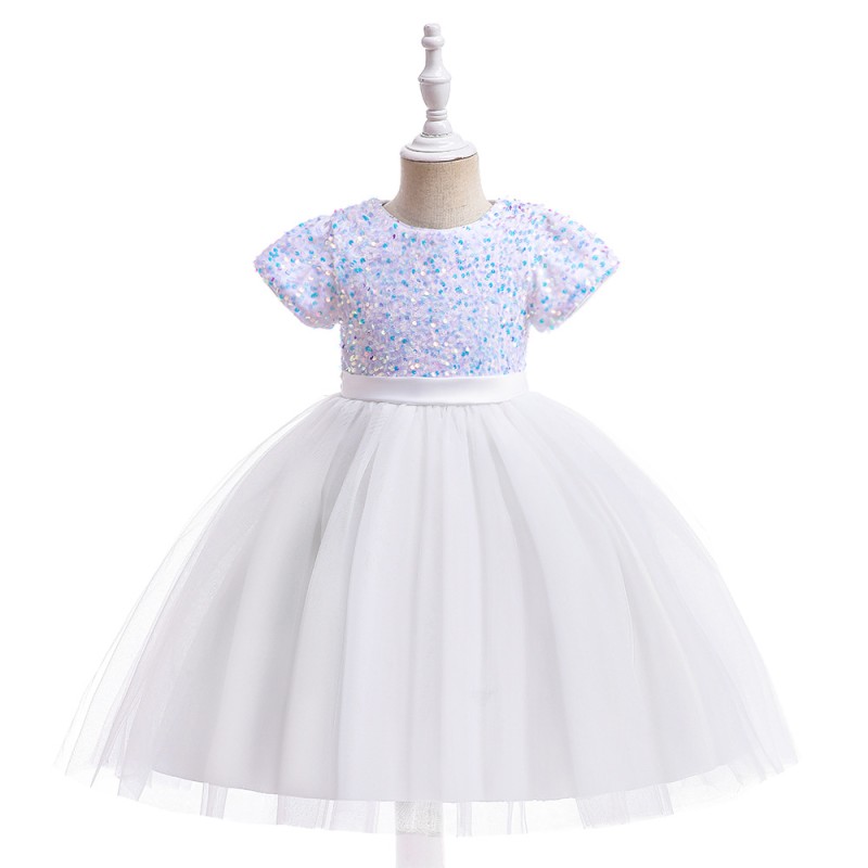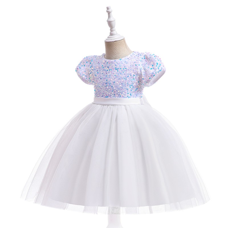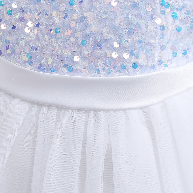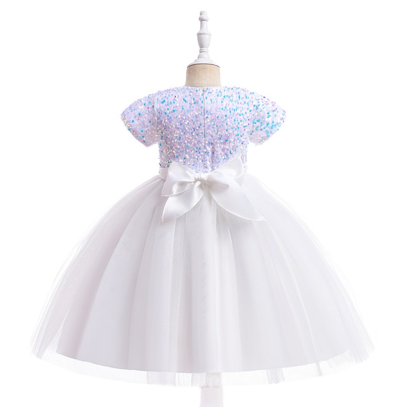 This stunning girls' dress features a white sequin top that sparkles and catches the light, adding a touch of glamour. The dress is complemented by a voluminous white tulle skirt and a large, elegant red bow at the waist, creating a charming and sophisticated look. Perfect for special occasions, this dress will make any little girl stand out.