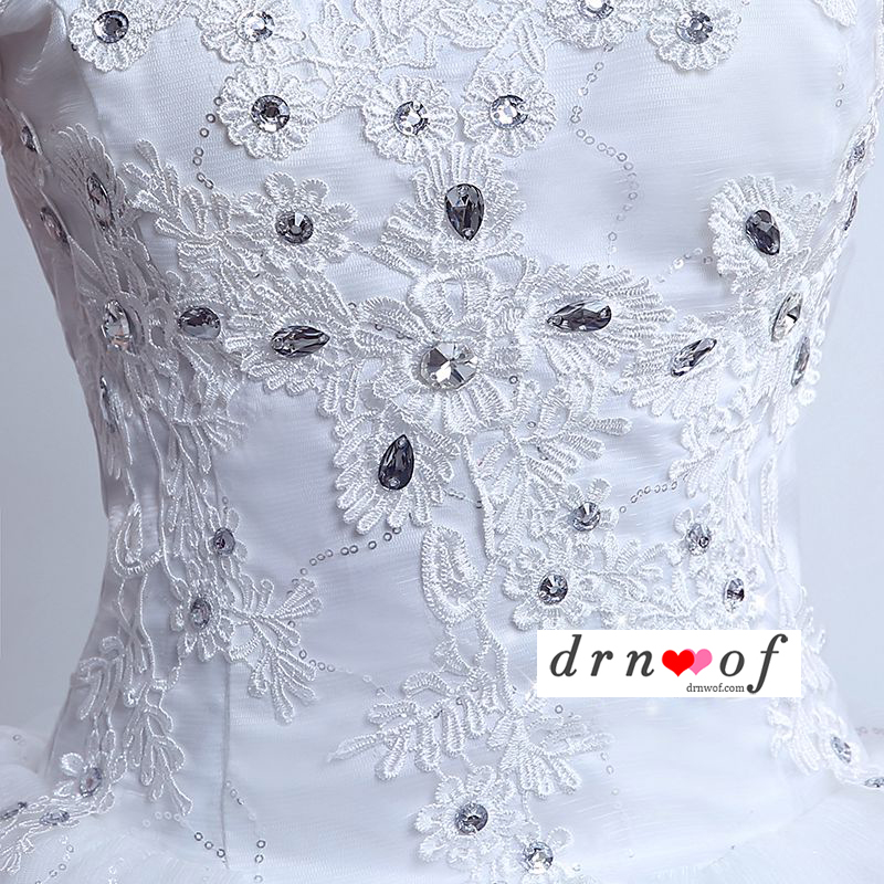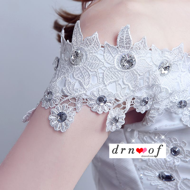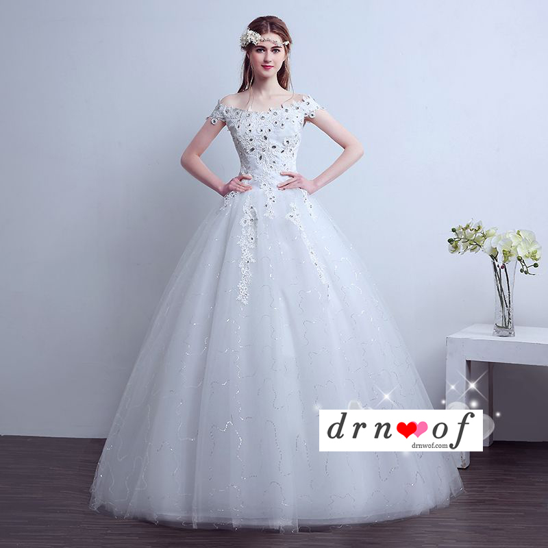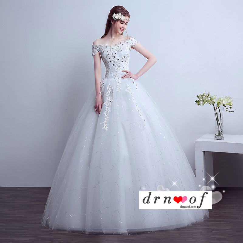 This stunning wedding dress features an off-the-shoulder design with delicate lace and sparkling embellishments on the bodice. The voluminous tulle skirt adds a touch of elegance and romance, making it a perfect choice for the bride. XN109WT