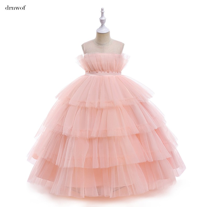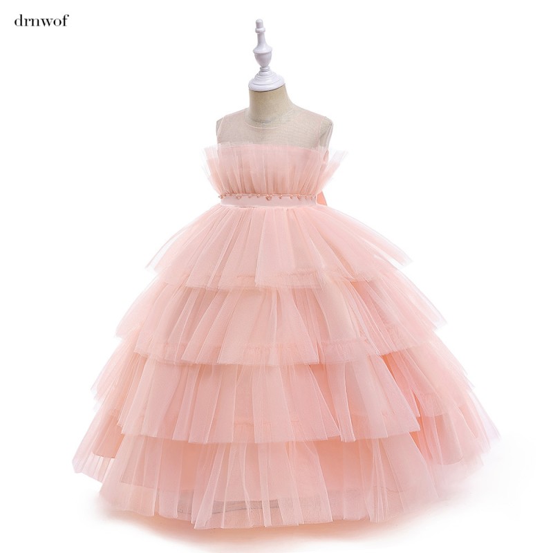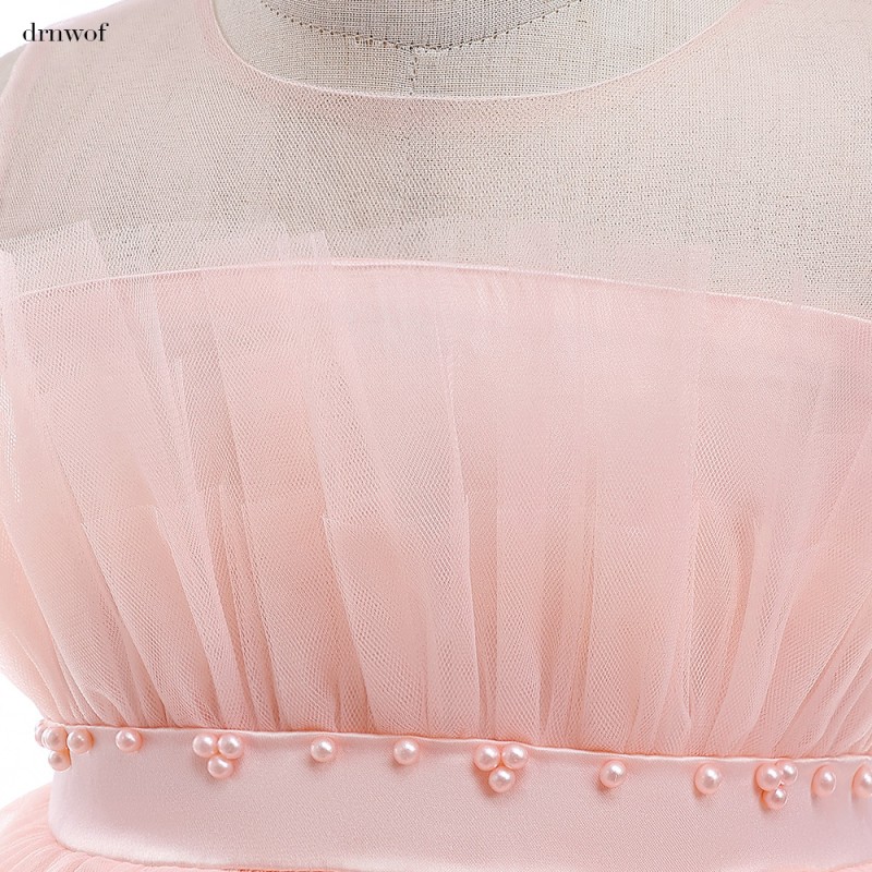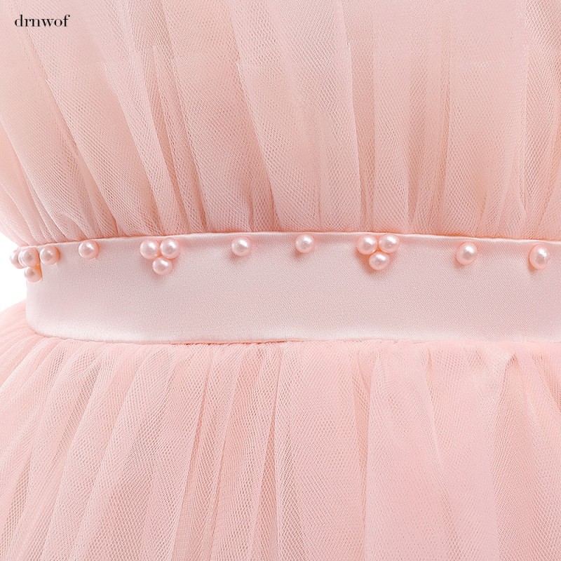 This charming girls' party dress features a lovely pink tulle skirt with multiple layers, creating a fluffy and elegant look. The dress has a strapless design and a beautiful bow at the back, adding a touch of sweetness. It also includes a satin belt adorned with delicate pearls around the waist for an extra touch of sophistication.
