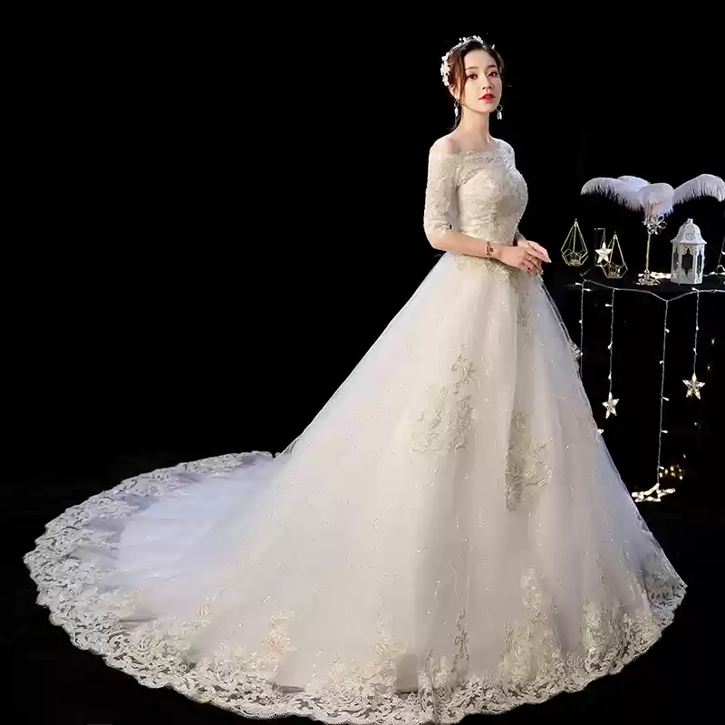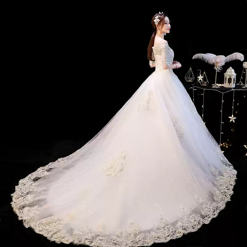 This gorgeous wedding dress features an off-the-shoulder design with elegant lace and beading on the bodice. The full ball gown skirt, adorned with delicate lace trim and sparkling details, creates a romantic and luxurious look for the bride. XN144WT