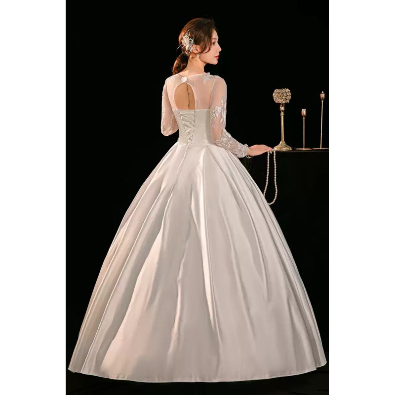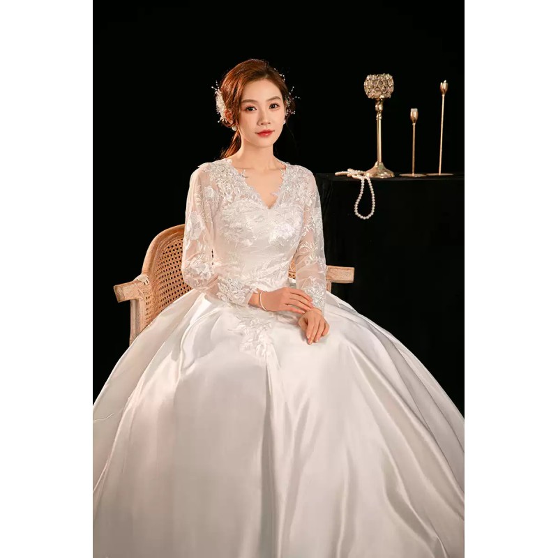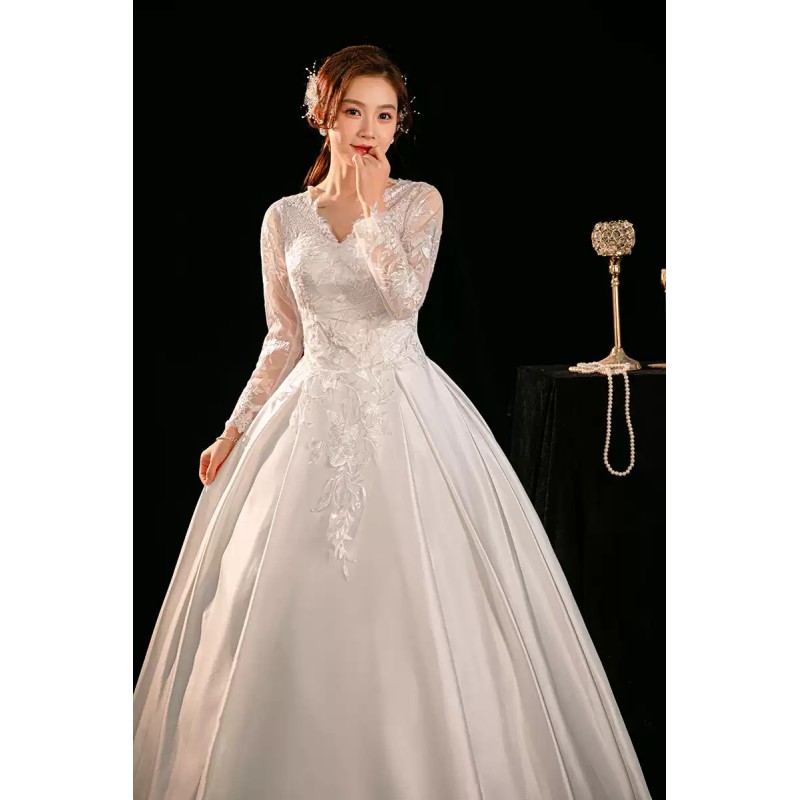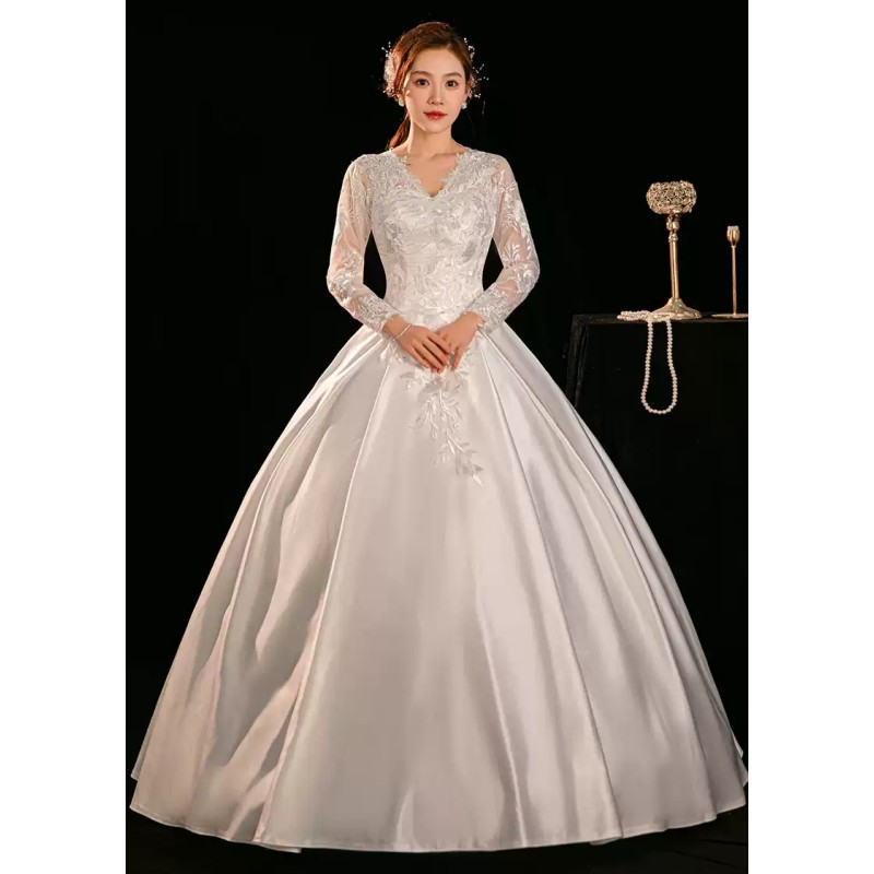 This exquisite wedding dress features a classic ball gown silhouette with a V-neckline and long lace sleeves. The bodice is adorned with delicate lace embroidery, while the full skirt is made of luxurious satin, creating a timeless and elegant look for the bride. XN143WT