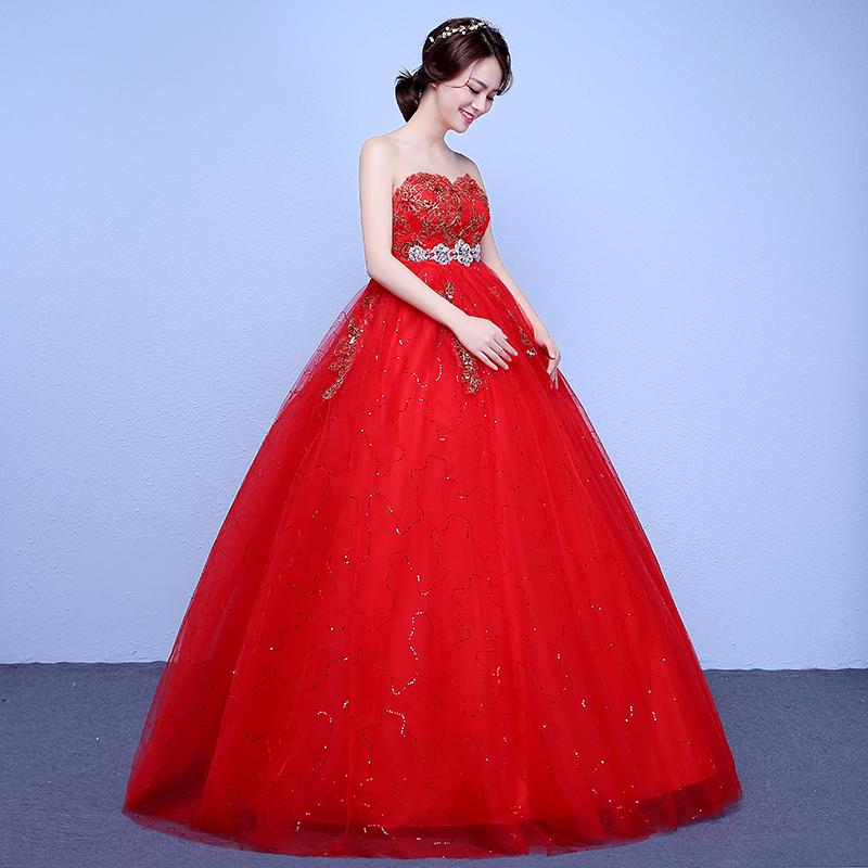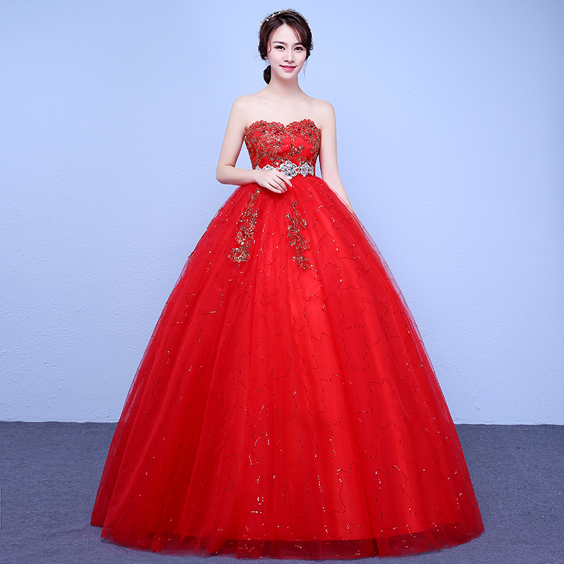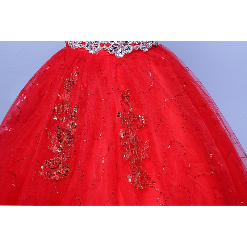 This elegant wedding dress features a strapless design with intricate lace detailing on the bodice. The full ball gown skirt is adorned with subtle sparkles, and a dazzling crystal belt adds a touch of glamour. A large satin bow at the back completes the look. XN102RD