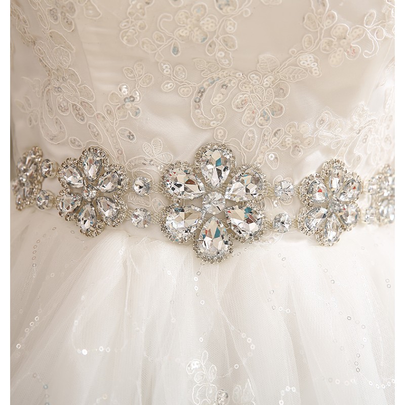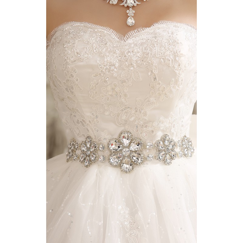 This elegant wedding dress features a strapless design with intricate lace detailing on the bodice. The full ball gown skirt is adorned with subtle sparkles, and a dazzling crystal belt adds a touch of glamour. A large satin bow at the back completes the look. XN102WT