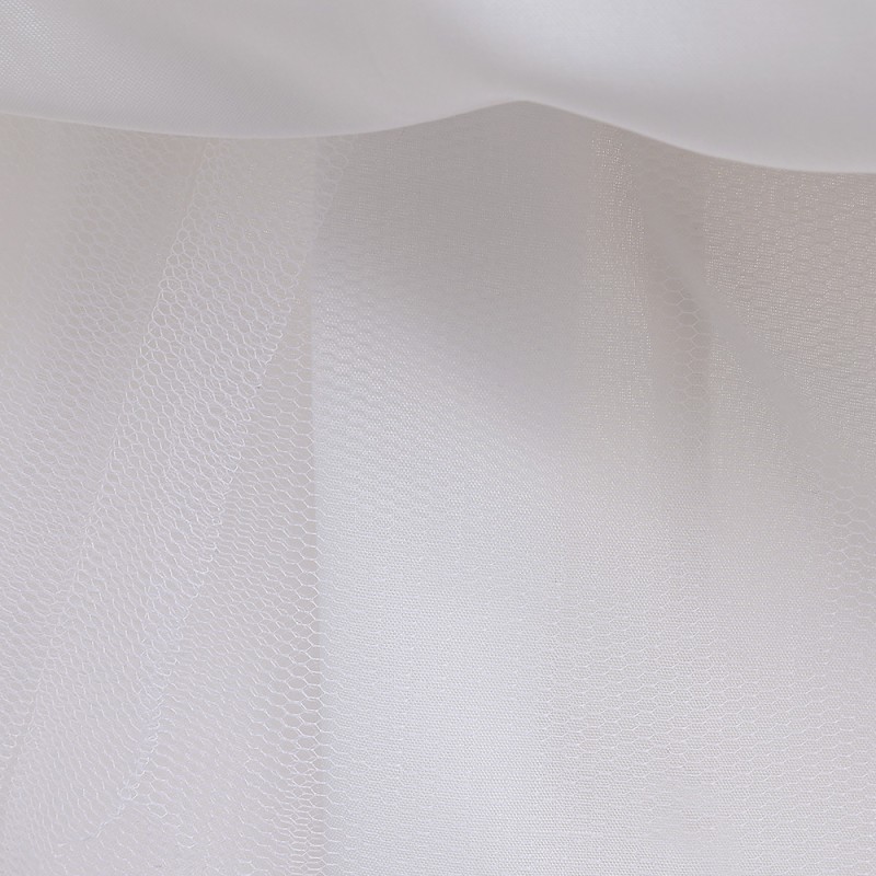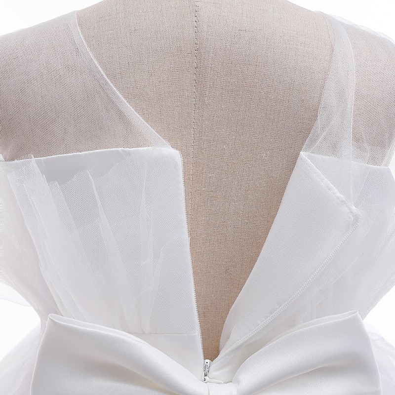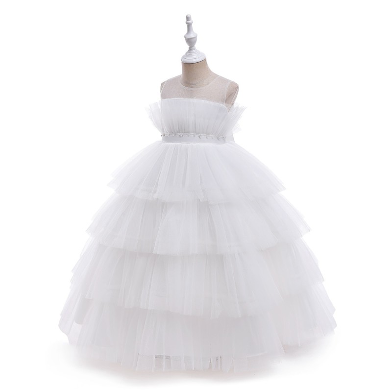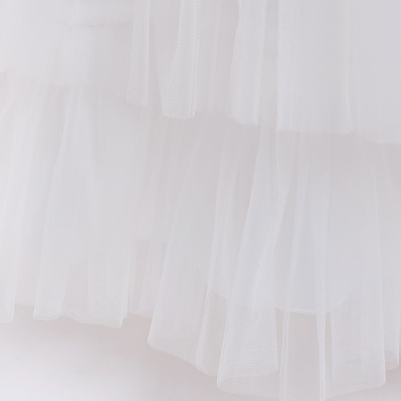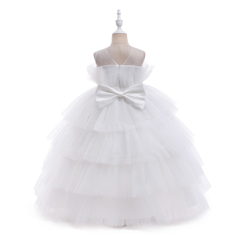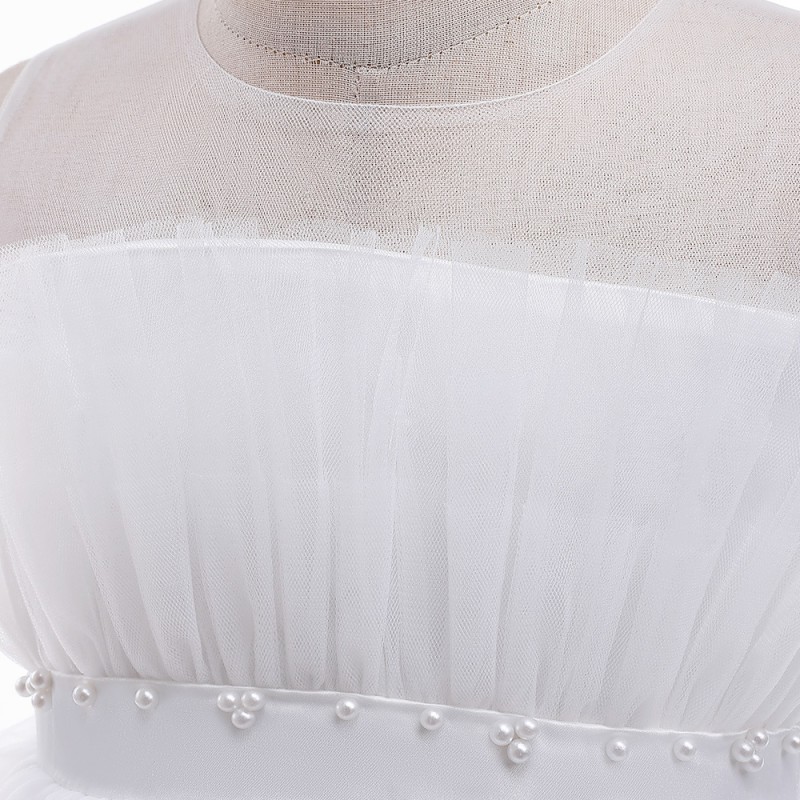 This charming girls' party dress features a lovely white tulle skirt with multiple layers, creating a fluffy and elegant look. The dress has a strapless design and a beautiful bow at the back, adding a touch of sweetness. It also includes a satin belt adorned with delicate pearls around the waist for an extra touch of sophistication.
