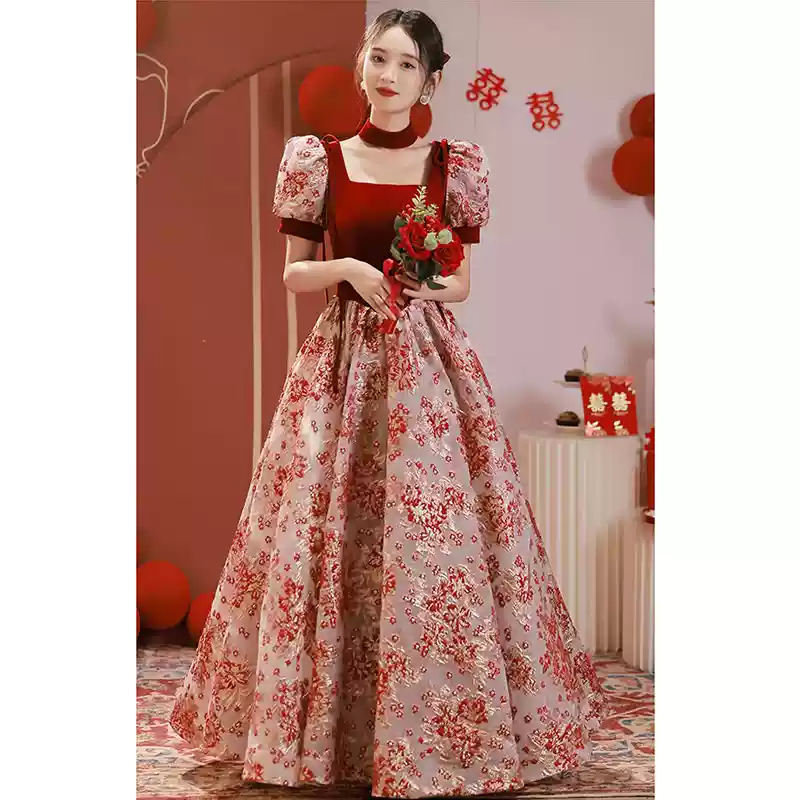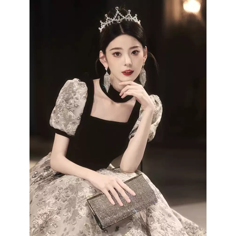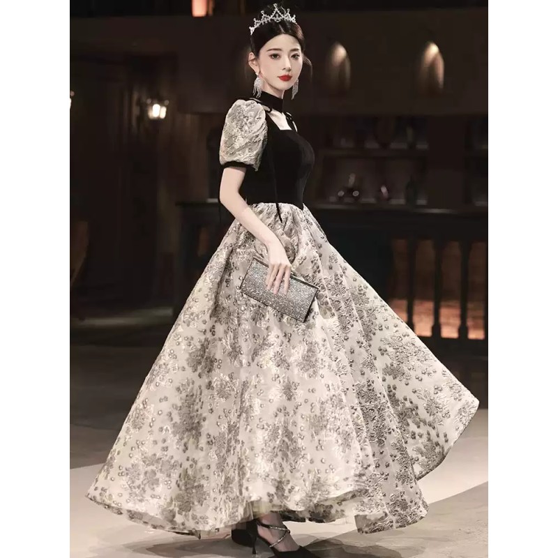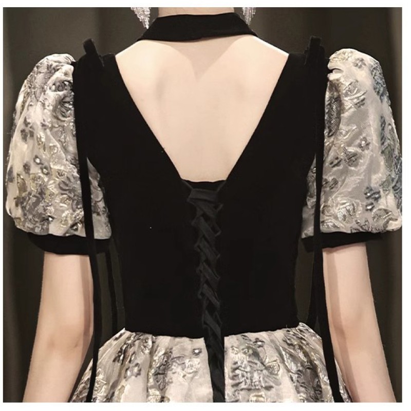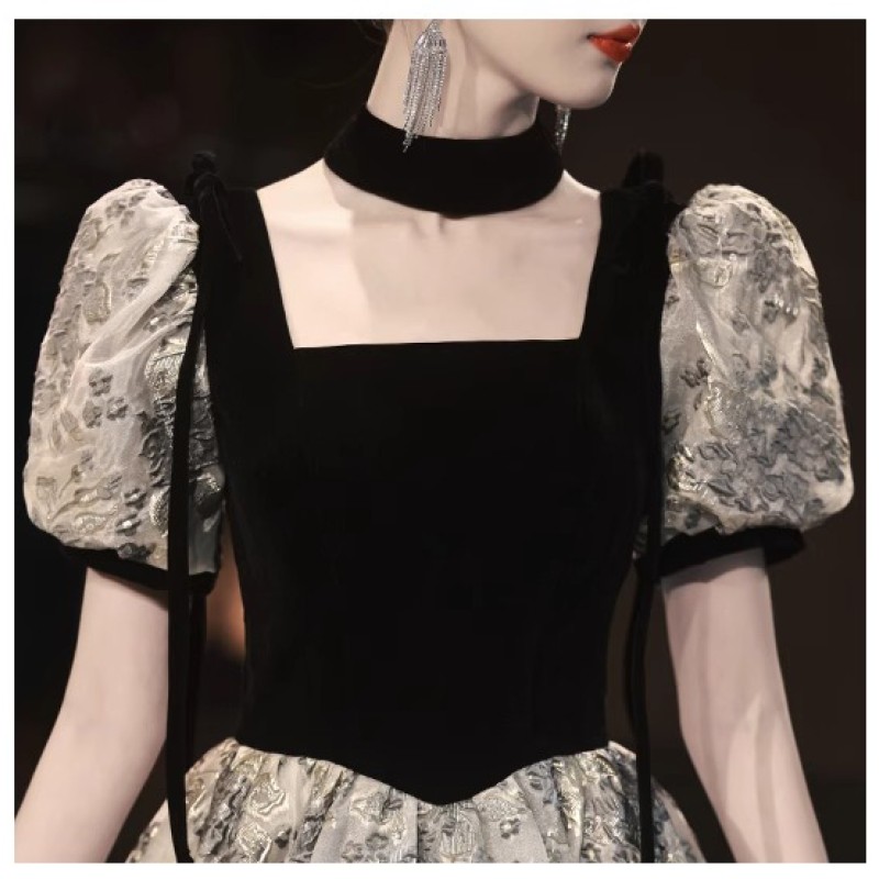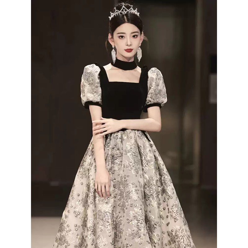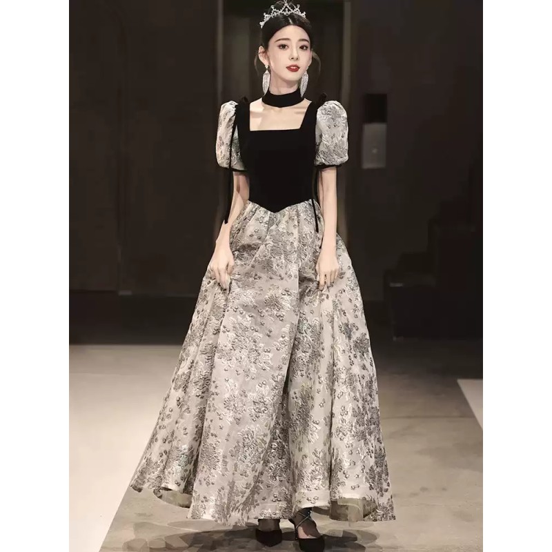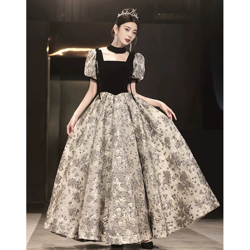 This eye - catching evening dress features a square neckline that exudes elegance and a touch of retro charm. The puff sleeves, adorned with intricate floral patterns, add a romantic and voluminous effect. The bodice is in a contrasting black color, creating a flattering silhouette, while the back showcases a stylish lace - up design. The long, flowing skirt is decorated with an elaborate floral brocade, making it a perfect choice for formal galas, banquets, or high - end social events.