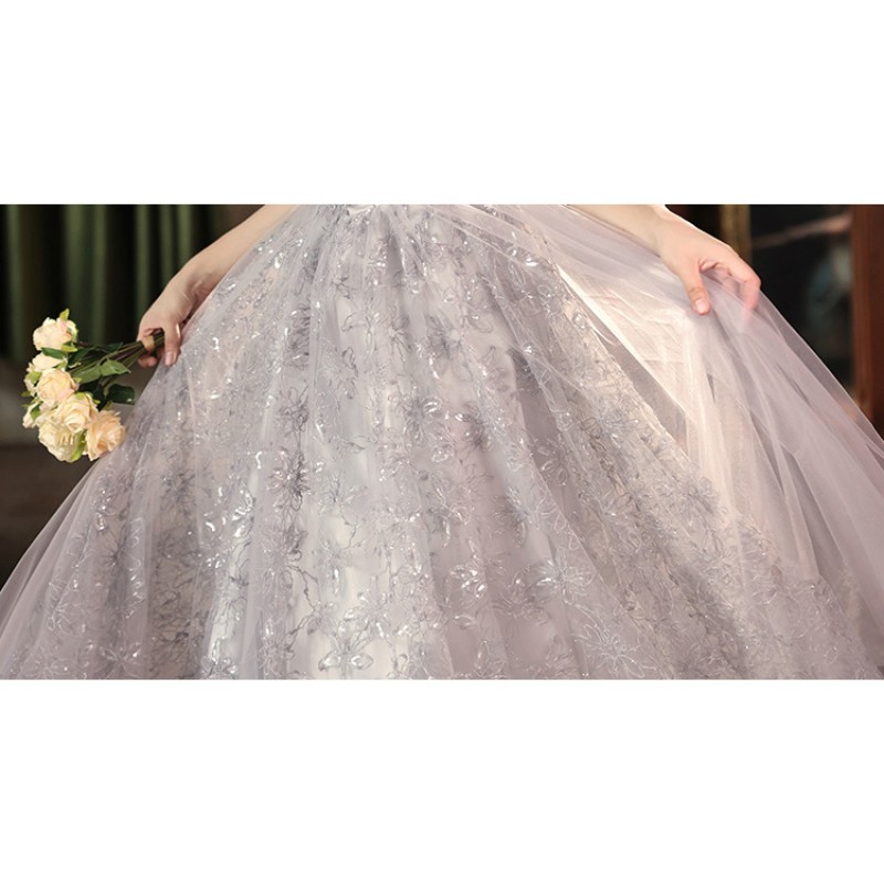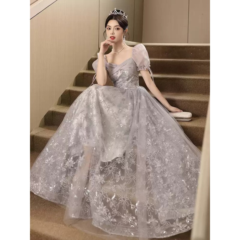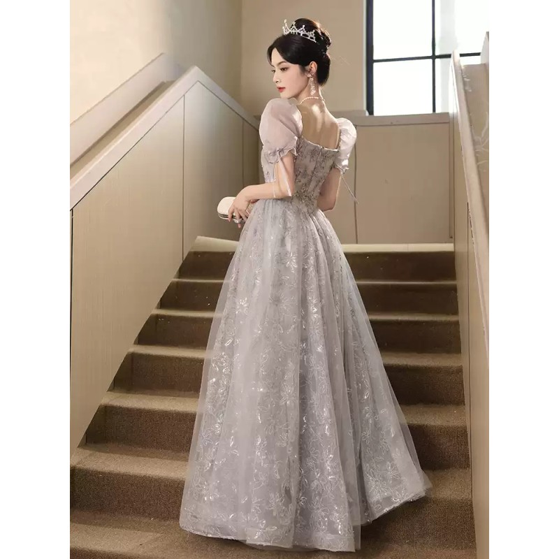 This alluring evening dress features dreamy puff sleeves crafted from sheer tulle, adding a romantic and whimsical touch. The light gray hue is both elegant and understated, while the bodice showcases intricate floral embroidery with subtle shimmering accents, enhancing its luxurious feel. The square neckline and fitted waist create a flattering silhouette, and the full, flowing tulle skirt adds a sense of grandeur. Ideal for upscale events like galas, weddings, or formal parties, it combines style and grace seamlessly.